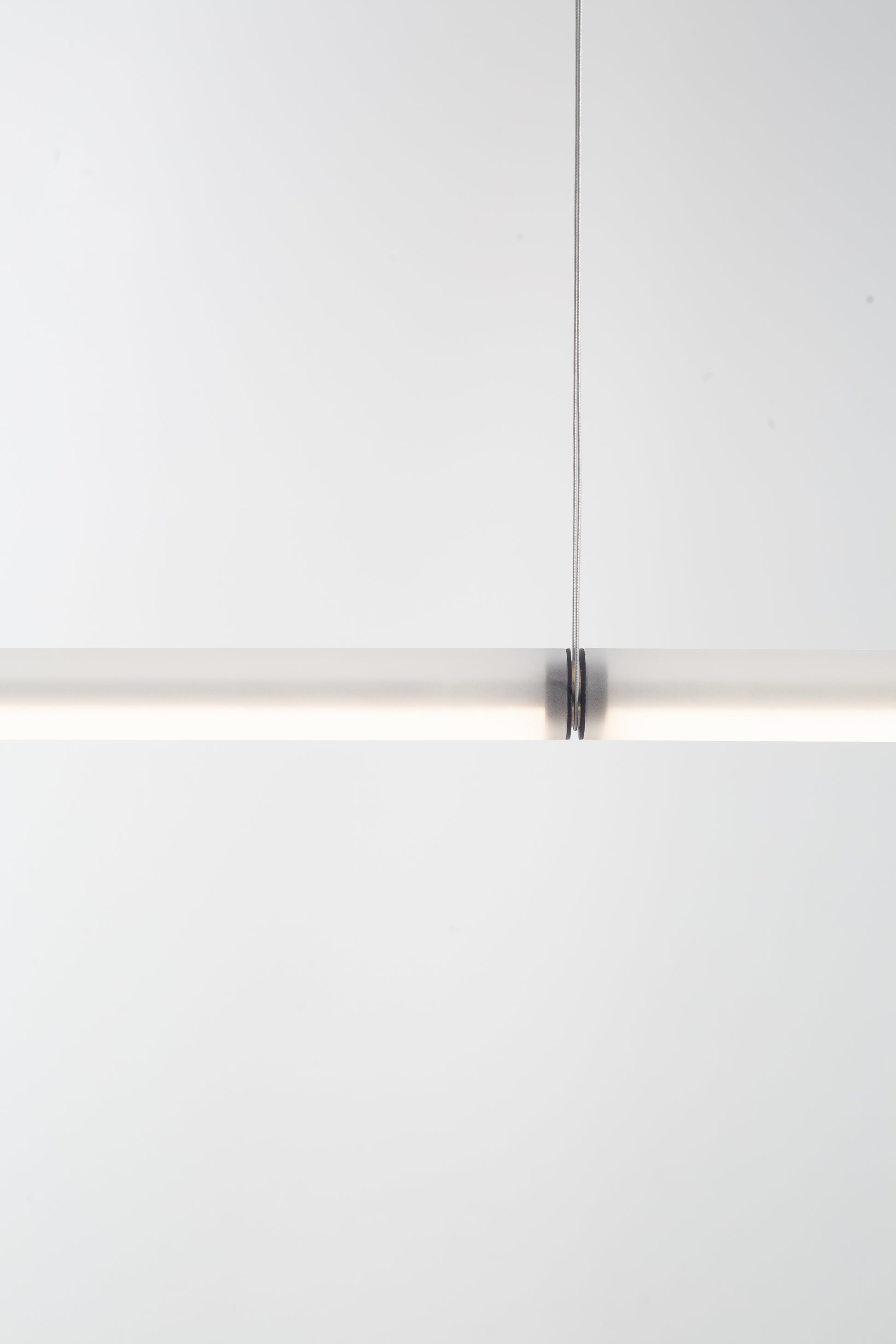 Handgefertigt in Italien, offenbart ein zweiter Blick die Leidenschaft für sorgfältige Herstellung in jedem Detail. LED's höchster Qualität erzielen eine möglichst natürliche Lichtwirkung. Ein herausragendes funktionales Detail der Satellit Leuchte ist, dass der Leuchtstab an zwei dünnen Stahldrähten hängt, die gleichzeitig der Stromversorgung dienen.