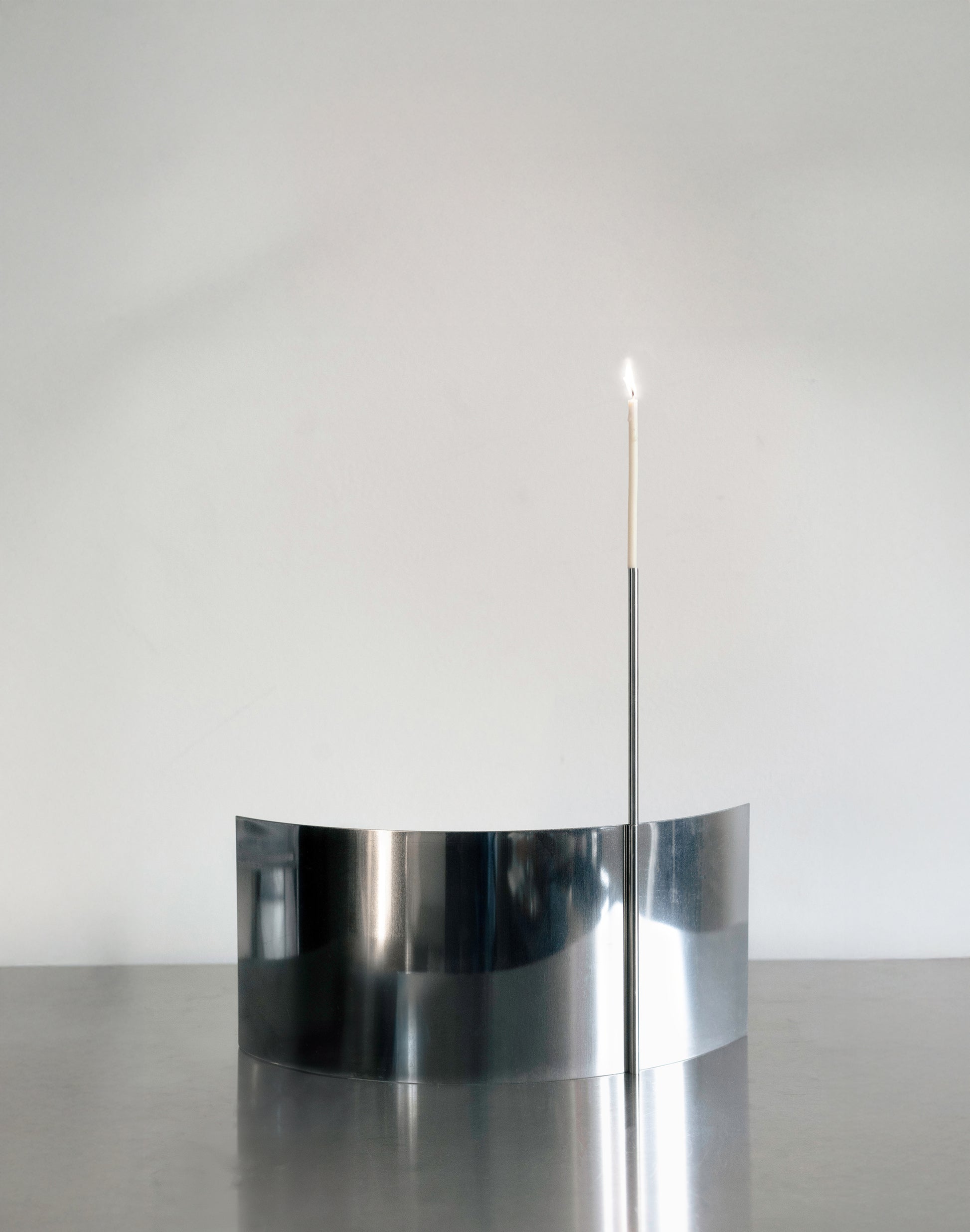 TANGENCY is a sculptural exploration of modularity in everyday objects by architect Anoe Melliou. Designed to attach effortlessly along a metal arc, multiple magnetic AXIS candle holders can be arranged individually, allowing customised arrangements to respond to the occasion. The arcs' subtle curve and slender candle sticks create a delicate play between materiality, form and surrounding space.