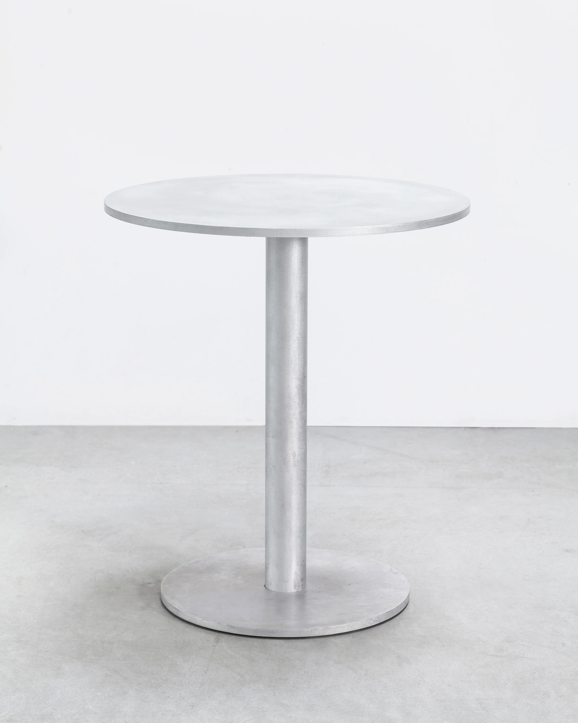 Reduced to its purest form and crafted from solid aluminum, the construction shows no visible welding marks. In subtle contrast to its minimalist silhouette, the surface is finished with a lacquered hammered coating. This traditional technique, historically used for industrial tools and machinery, introduces a tactile depth and understated character that enriches the table’s clean architectural presence.